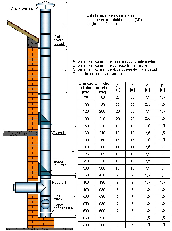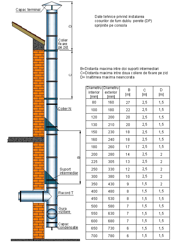 La distantele prevazute in anexele 1 si 2 (B respectiv C), se monteaza coliere de fixare de zid eventual suporti intermediari in functie de diametrul si inaltimea cosului de fum.